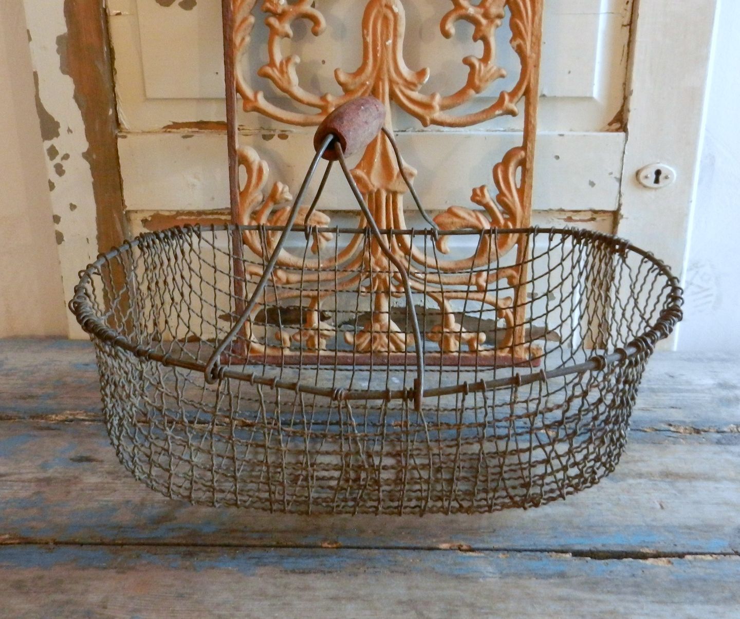 Gammel trådkurv med træ håndtag