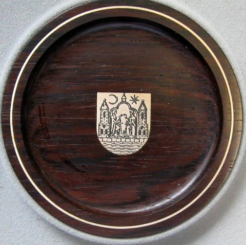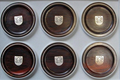 Vinglas bakker med Aarhus Kommunes segl. 6 stk. Efter 1962 Palisander med sølv. I æske fra A. F. Rasmusens Sønner. Søndergade 1 B, Aarhus. Hver bakke måler i dia.: 8,5 cm. Bakkerne er udarbejdet i Århus af sølvsmed Arthur Schmidt Christensen (1962 - ). Gave fra Aarhus Kommune.