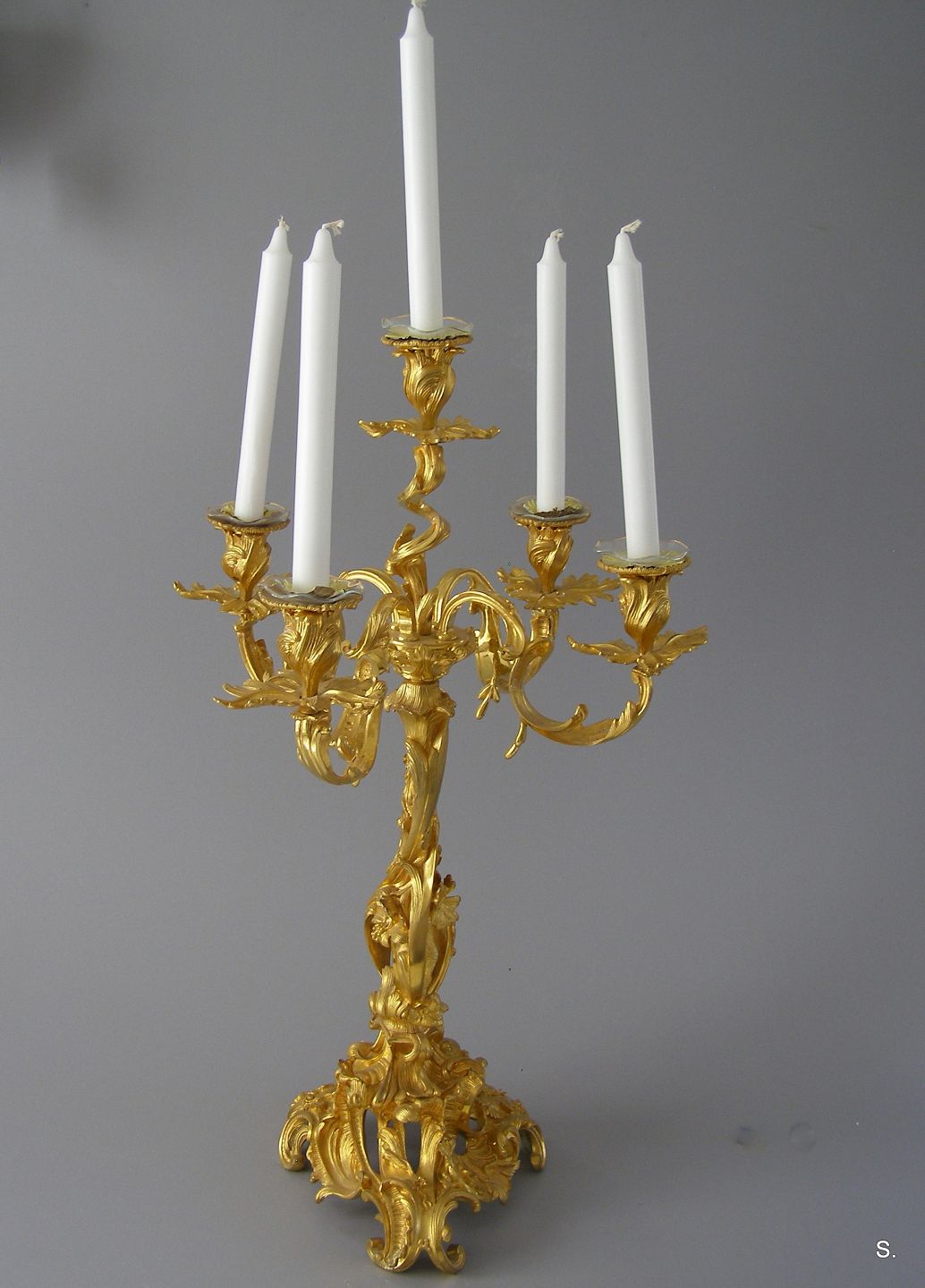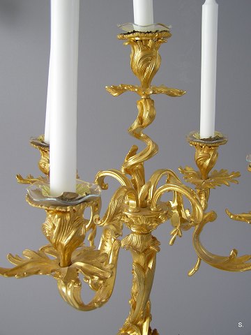 Par franske Rokoko kandelabre 5-armede, af lueforgyldt bronze, rigt prydet med rocailler, blomster og bladværk i form af drueranker, stamme gennembrudt, H: 72 cm.