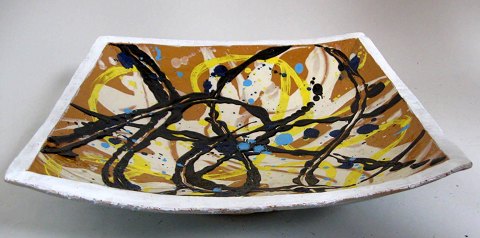 Stort keramisk fad. 1998. Lys begitning med ovedekorationer i sort, lys beige, hvidt og blå. Let bøjet kant. H.: 9,5 cm. 42 x 42 cm. Signeret: Don Roy 28.9.98