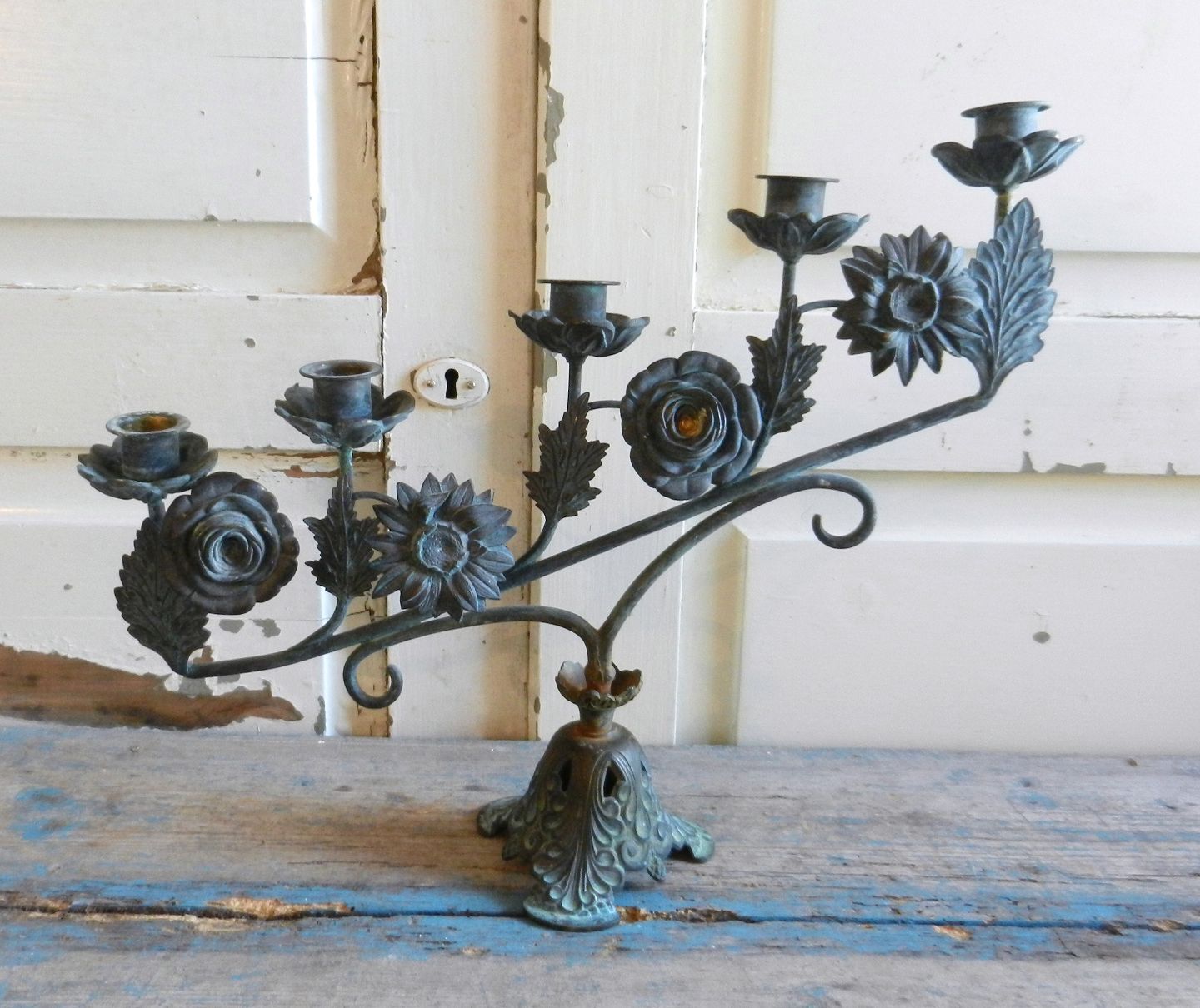 Smuk fransk sort patineret kirkestage til 5 lys.