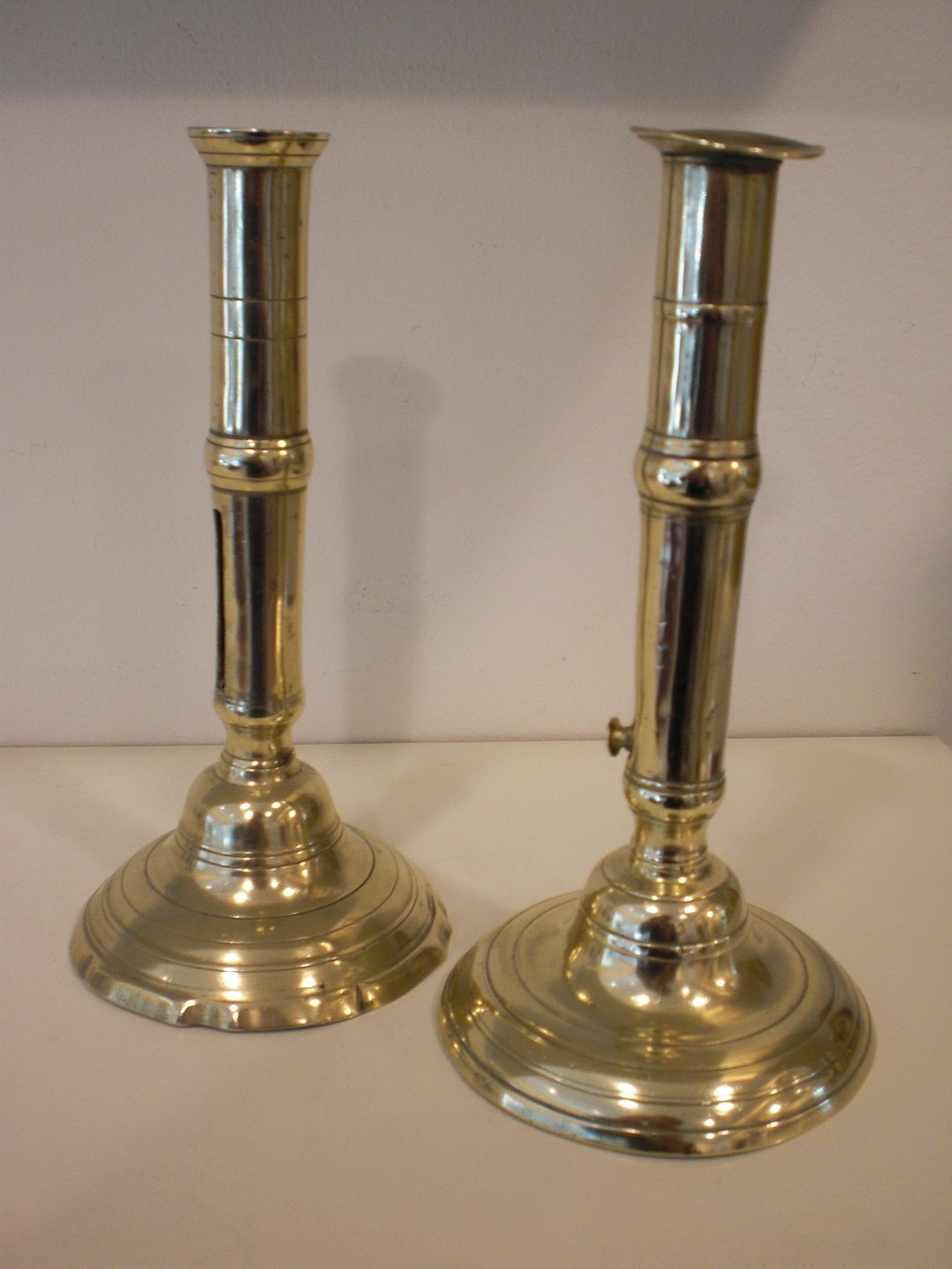 Et par tidlige 1800-tals messingstager formentlig franske ikke helt identiske - der mangler skrue i den ene og denne har let bølget fod uden krage. Den anden har glat fod og krave med en revne. Sælges alligevel som par. Højde: 20 cm.