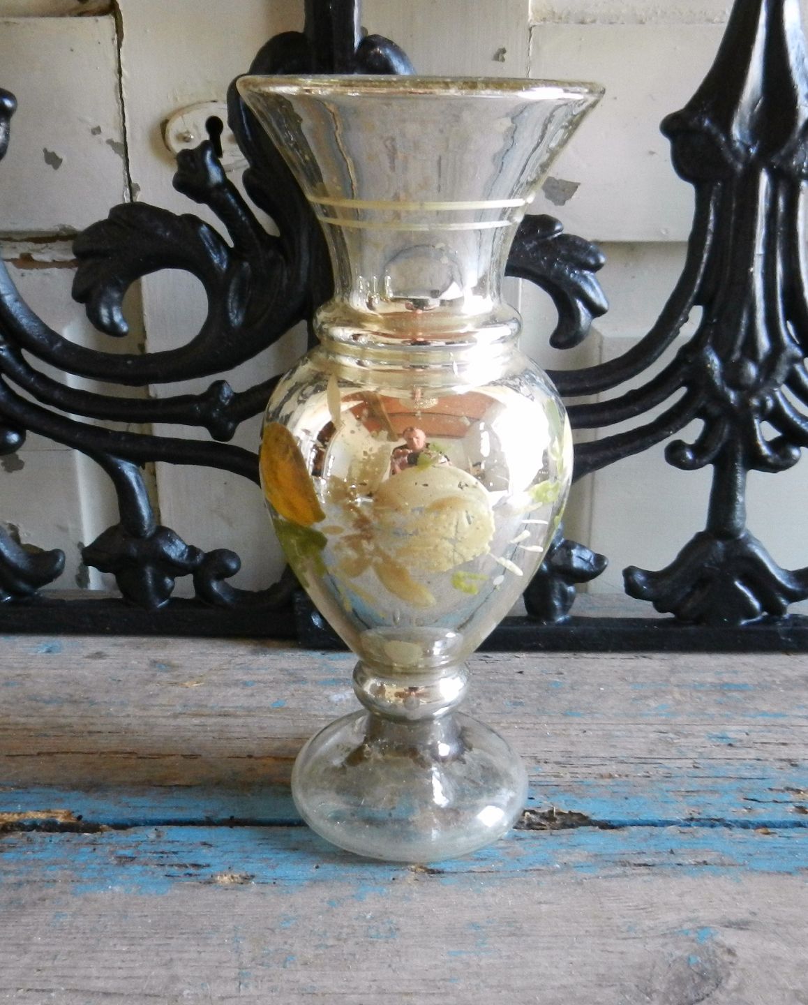 Vase i fattigmads sølv med håndmalet deoration, fremstår med super fin patina.