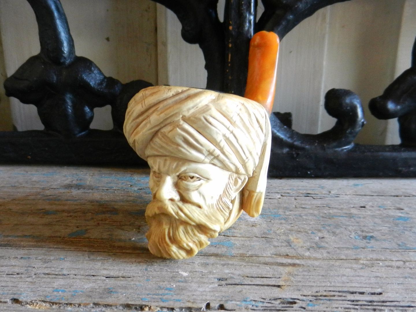 Meget flot udskåret merskumspibe med mundstykke i rav.