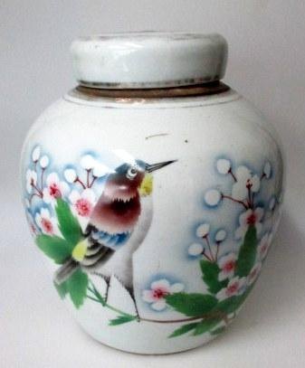Chinese lidded vase o. 1900, porcelain, with polychrome decoration in the form of bird on a branch with flowers. With remnants of gilding on the jar and lid. In the body text in Chinese. A large part of the decoration is performed by template. H. 21 cm. Perfect condition!