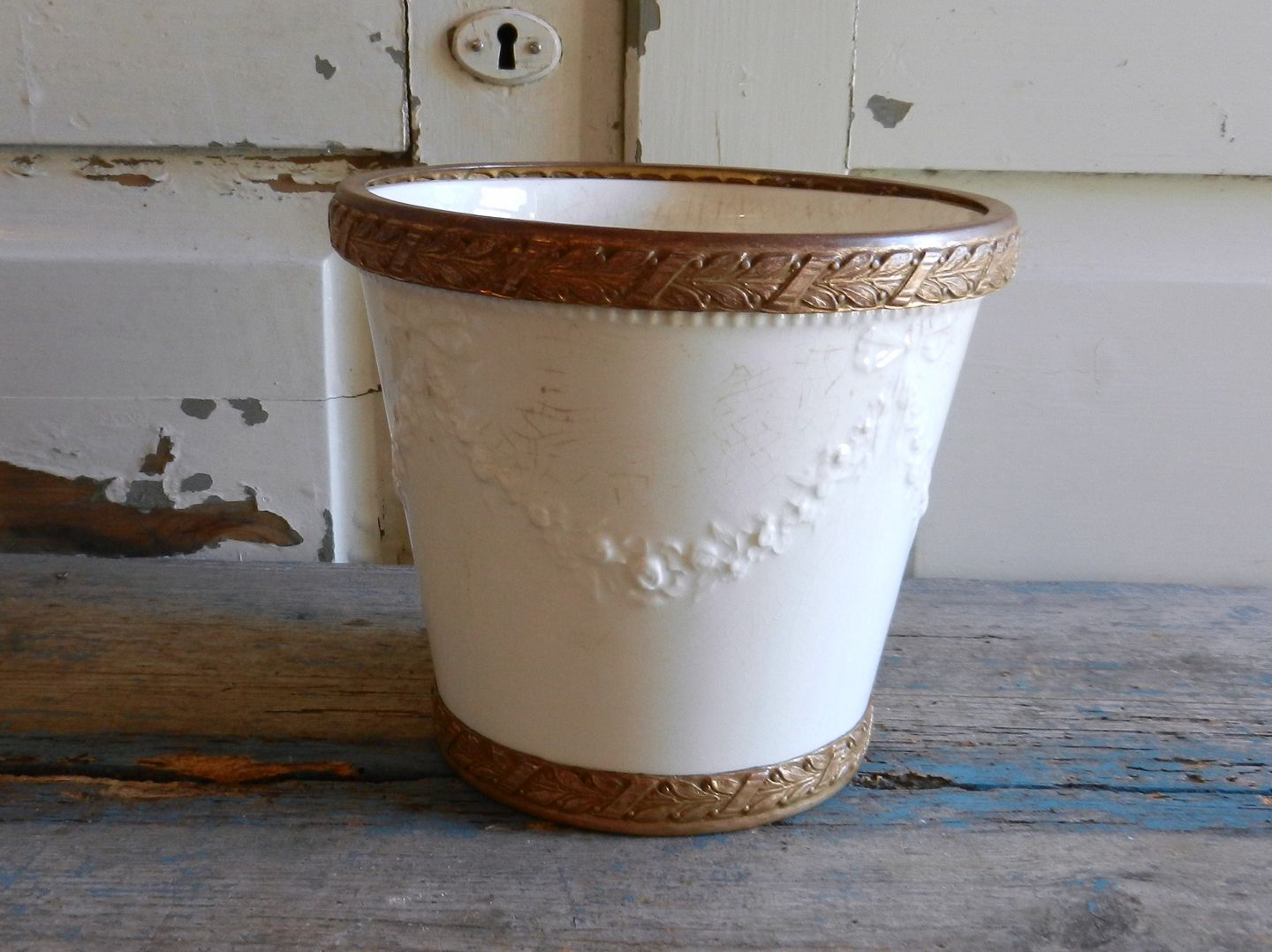 Smuk fajance urtepotte med forgyldt bronze montering