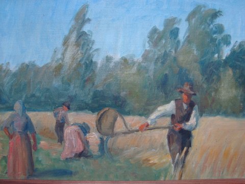 Maleri af Holger Hansen - Høstparti med arbejdende personer.