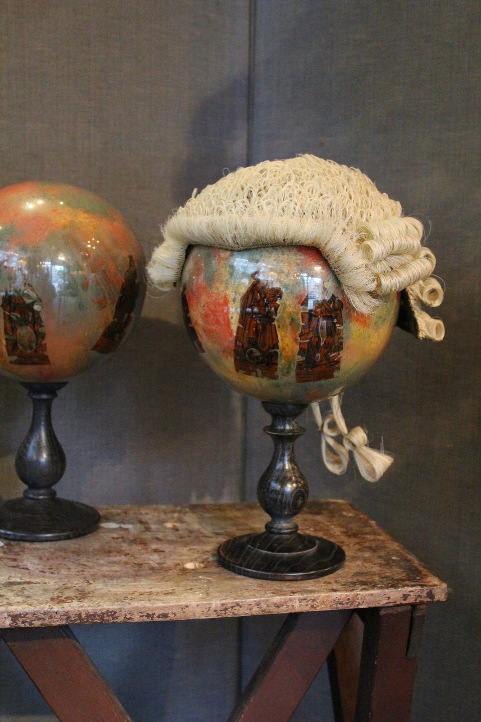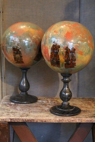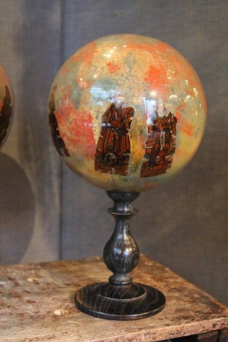 Antik Fransk dekoreret glas kugle på sort træ fod.