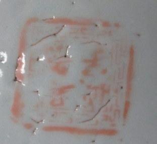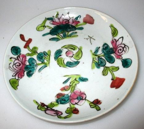 Kinesisk skål, 19. årh. Famille Rose. Grålig porcelænsmasse med bemalinger i grønt og rødt. H.: 2,0 cm. Dia.: 13,5 cm. Stemplet. Proveniens.: Dansk kommandør kaptajn.