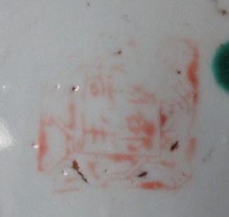 Kinesisk skål, 19. årh. Famille Rose. Grålig porcelænsmasse med bemalinger i grønt og rødt. H.: 2,4 cm. Dia.: 13,9 cm. Stemplet.