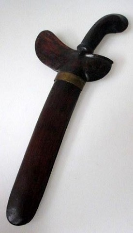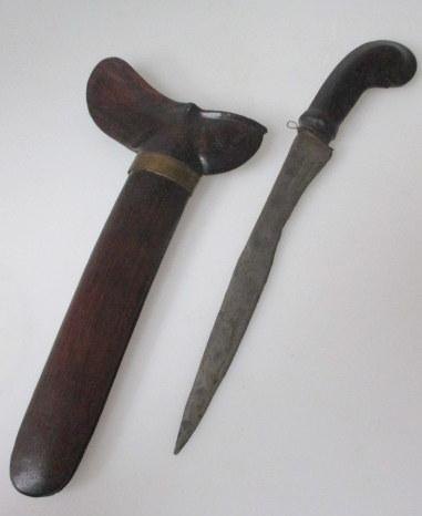 Indonesisk kris, o. 1928. Flammet jern klinge. Håndtag og etui af træ. L.: 31 cm.