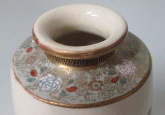 Satsuma vase, 19. årh. Fajance. Dekoration af kimono klædte kvinder i et landskab. Topdekoration i form af roser. Polykrom dekoration med forgyldninger. H.: 13 cm. Stemplet med to kararakter mærke. Virkelig et flot stykke.