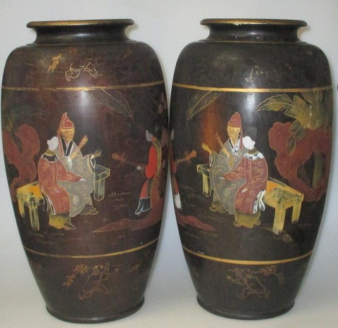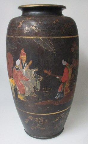 Couple of Japanese vases, 19th century. Pottery. With brownish glaze and hand-painted scenes of two people listening to a playing man. Polychrome decoration. With gilt in gold and silver. At the top and bottom of the vase there are decorations of playing children. Height .: 32 cm. At the bottom stamped .: Made in Japan.