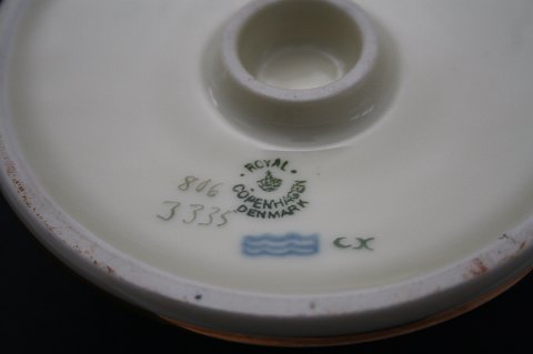 Royal Copenhagen, Aurikel. Creme farvet, svejfet porcelæn med Aurikel blomster og guldkant. Lysestage. Nr. 806/3336. Højde 6 cm. Diameter 12 cm. I. sortering. Pris: 225 kr. stk. Lager: 2. (den ene har brugsmærker i selve hullet til lyset)