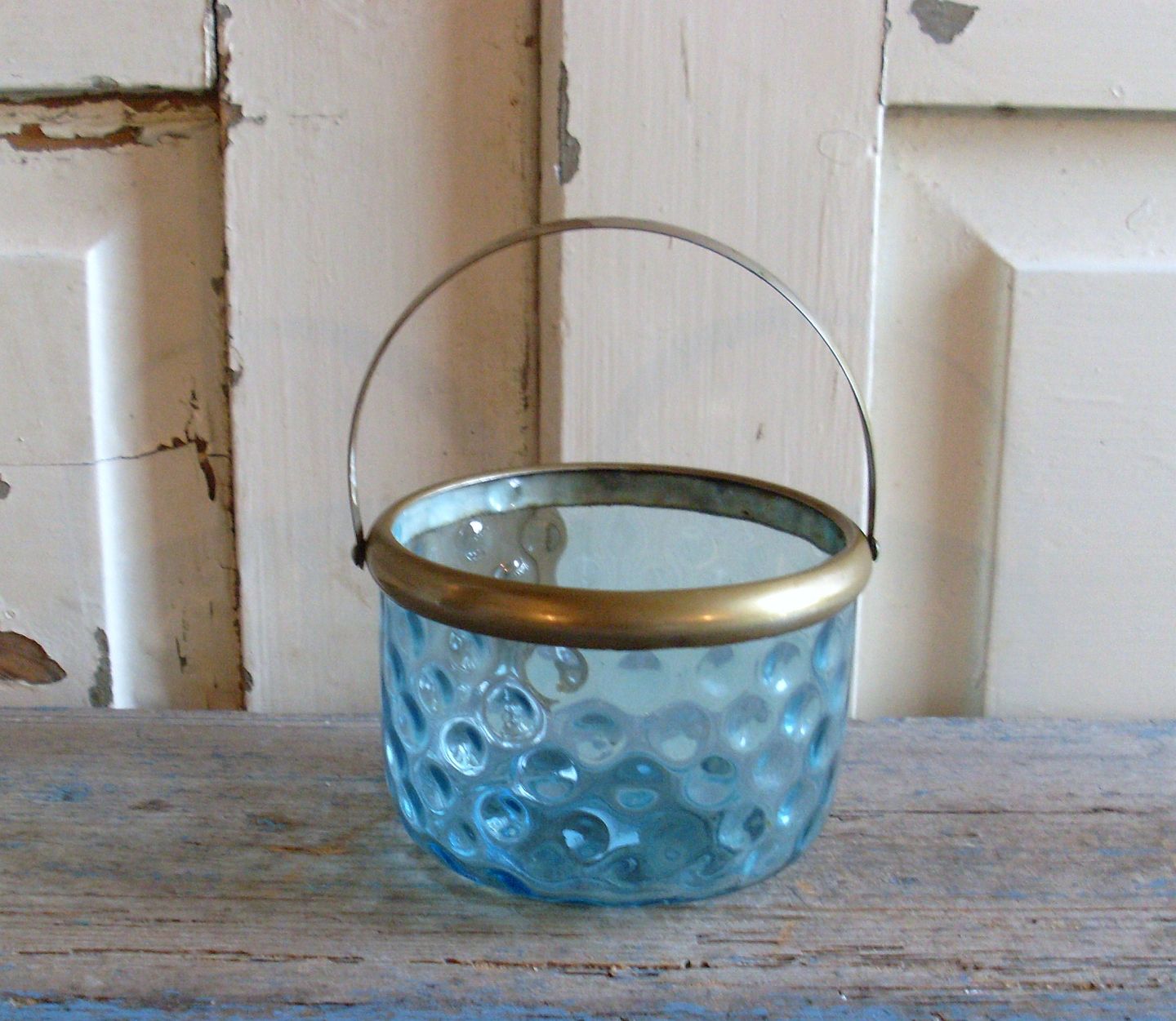 Sukker skål i lyseblåt glas med øjet optik, monteret med messing hank.