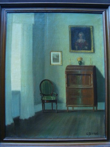 Maleri af Frederik Drews - Interiør med chatol og adelsportræt.