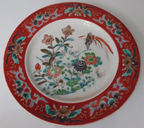 Famille rose tallerken i porcelæn, Kina, 19. årh. Rød kantdekoration med blomster. Spejl med flyvende fugl og buske. Dia.: 21,5 cm.