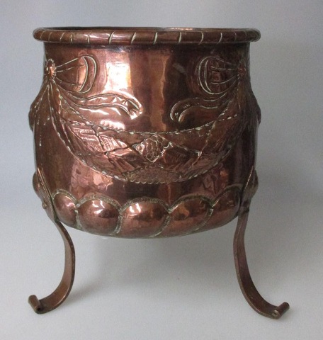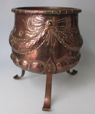 Haraldskjær Kobber Fabrik urtepotte, 19. årh. Danmark. Dekoreret på korpus med guirlander og sløjfer. På tre ben. Ustemplet. H.: 20,5 cm. Dia.: 19 cm.