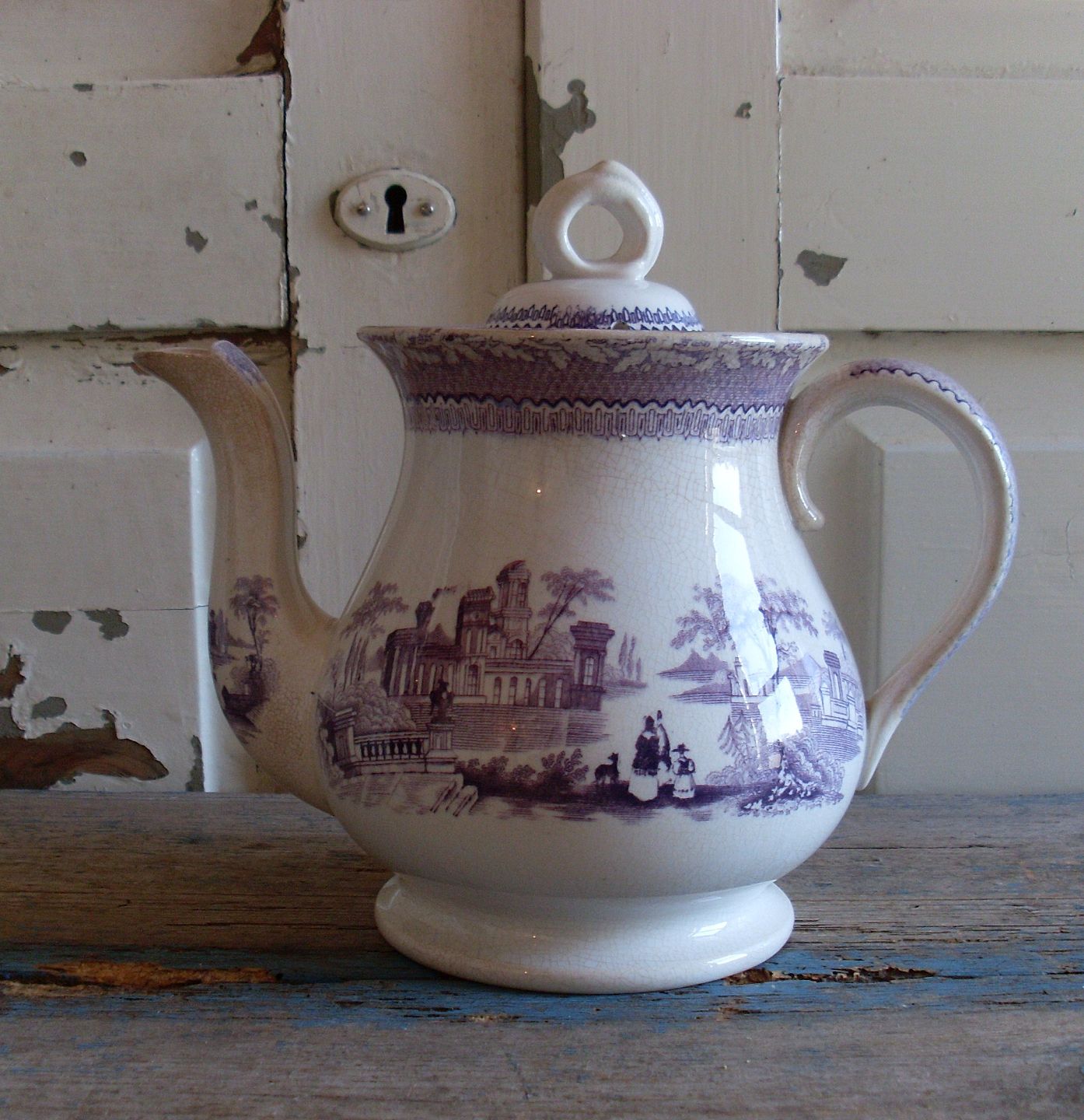 1800tals fajance te kande, skønt dekoreret med lilla kobbertryk.