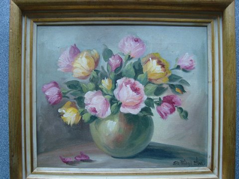 Maleri af Eva Fliegl - Gule og lyserøde roser i vase.