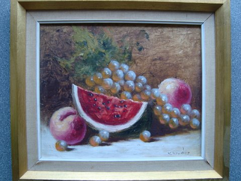Maleri af K. Kovacs - Opstilling med vandmelon, druer og ferskner.