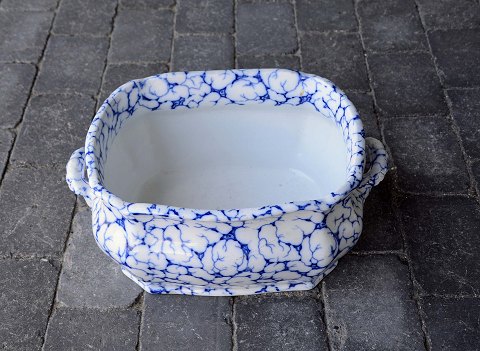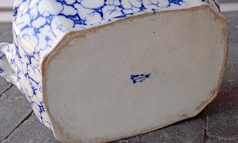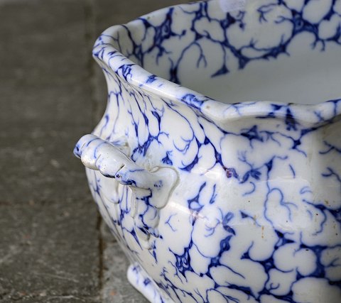 Stort porcelænskar med hanke. Det er et gammelt kar i porcelæn, og det er stemplet "Lazuli". Lazuli stammer fra det arabiske ord Azula, der betyder blå. Vi har ikke fundet fabrikken, men tror at den er engelsk. Den er i pæn stand. H. 21 cm. L. 46 cm. B. 32 cm.