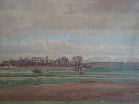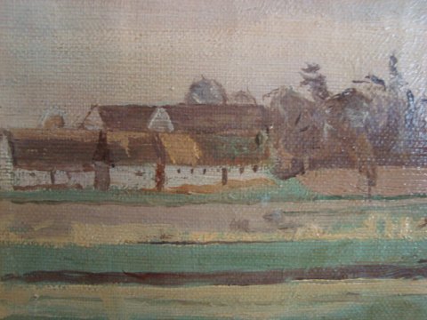 Maleri af Hans Knudsen 1921 - landskab med gårde.