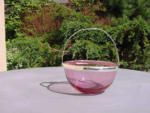Lyserød sukkerskål i glas m. plethank, fra Holmegaard Glasværk, Danmark ca. 1920.