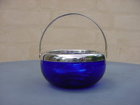 Blå sukkerskål i glas m. plethank, fra Holmegaard Glasværk, Danmark ca. 1920.