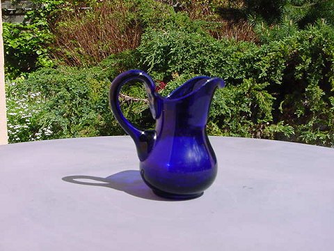 Blå flødekande i glas, fra Holmegaard Glasværk, Danmark ca. 1920.