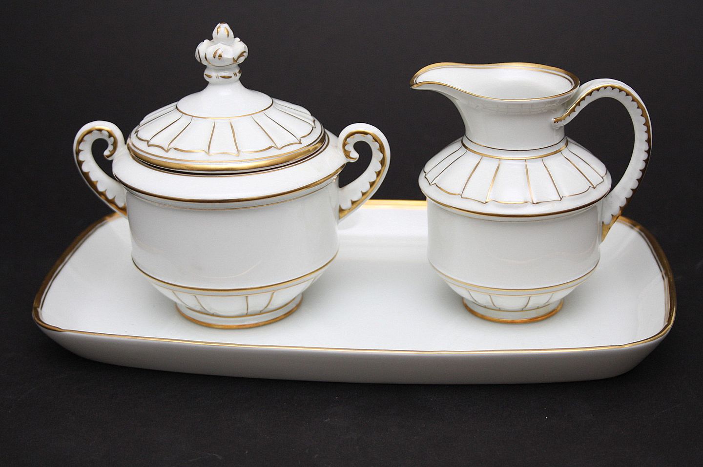 Text available in Danish: Bing & Grøndahl, Offenbach, hvidt porcelæn med knækkede kanter og guld. I. sortering.