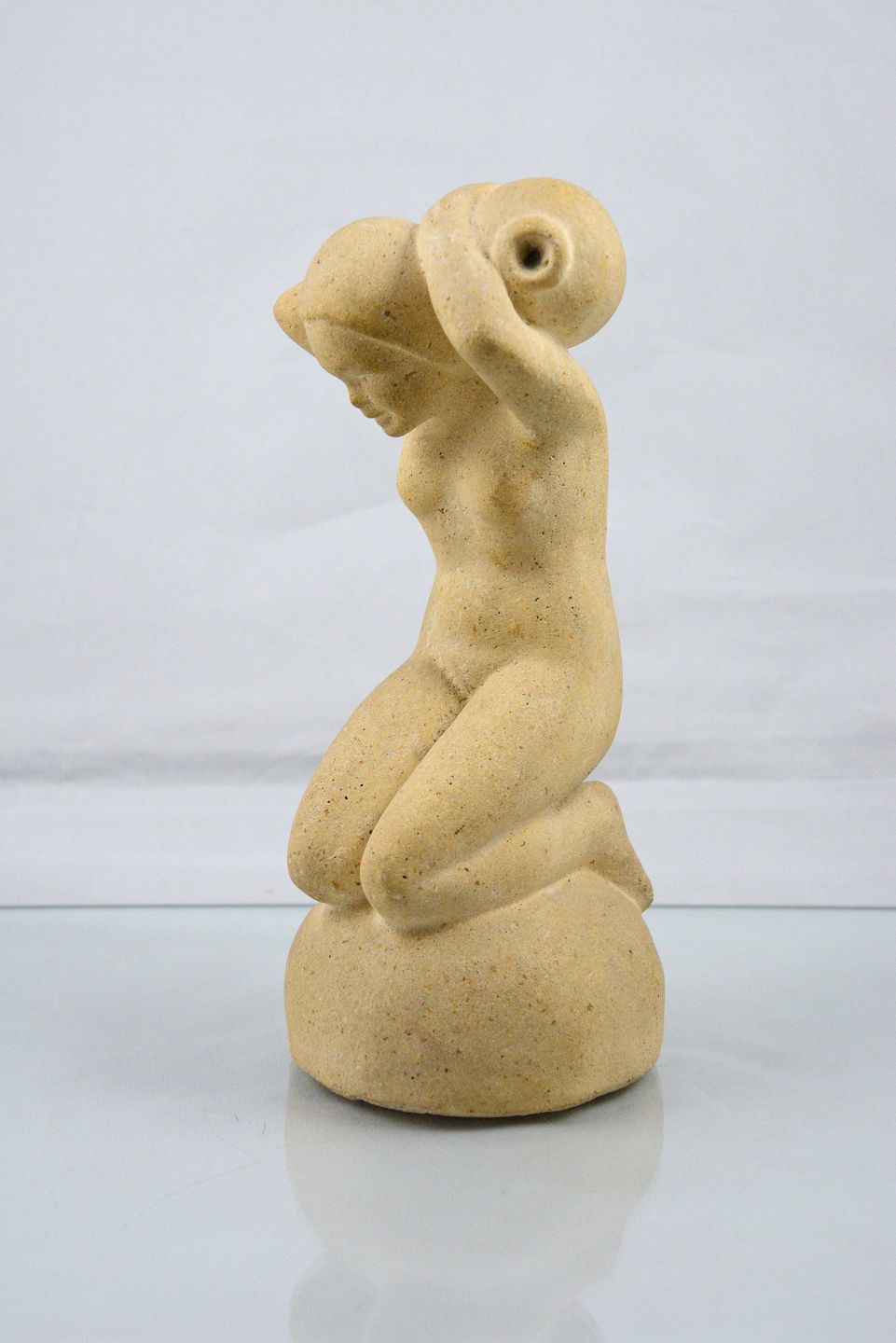 Figur i sandsten med motiv af siddende nøgen kvinde med vandkrukke