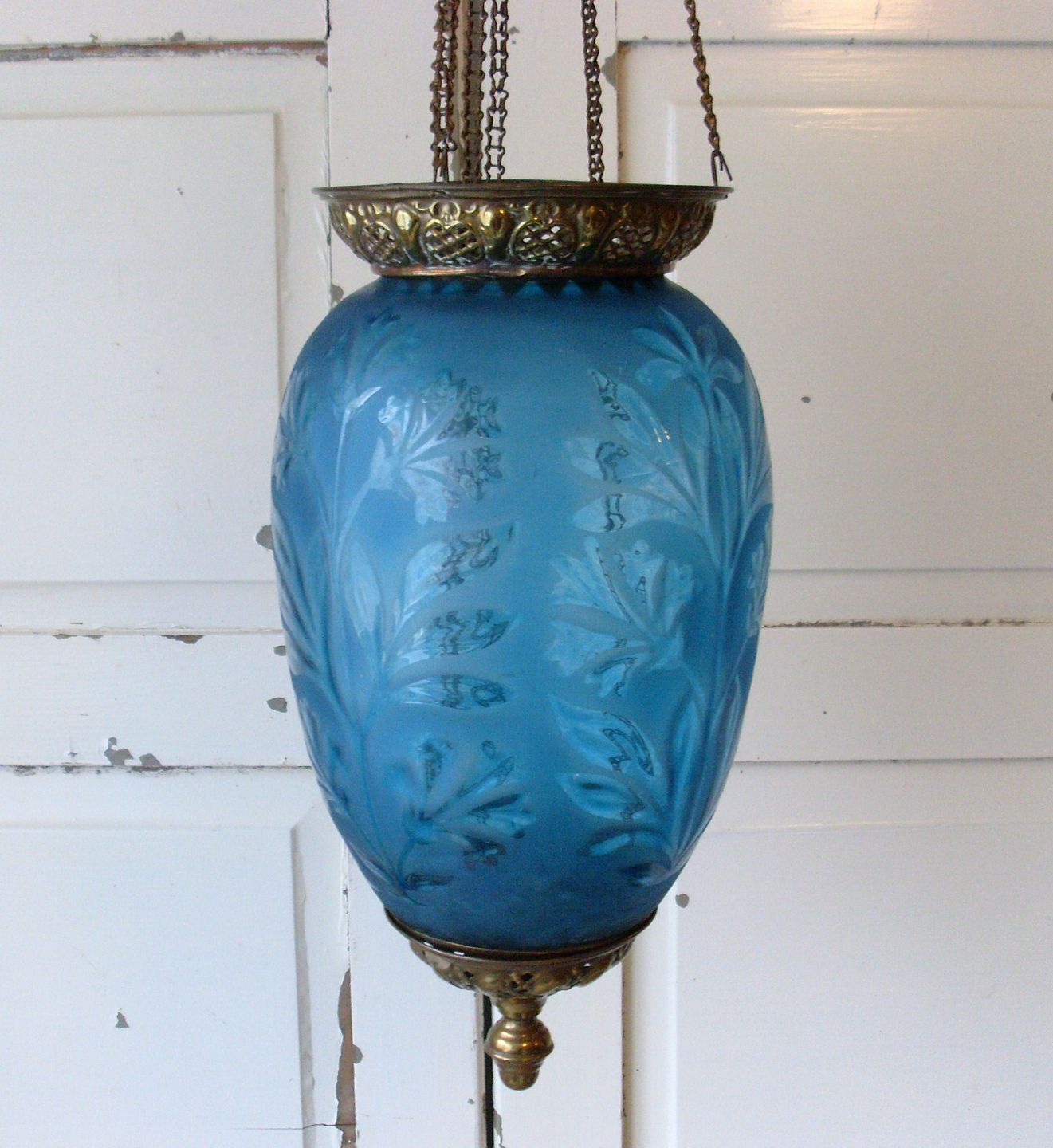 Smuk petroliums blå ampel med ætset dekoration.