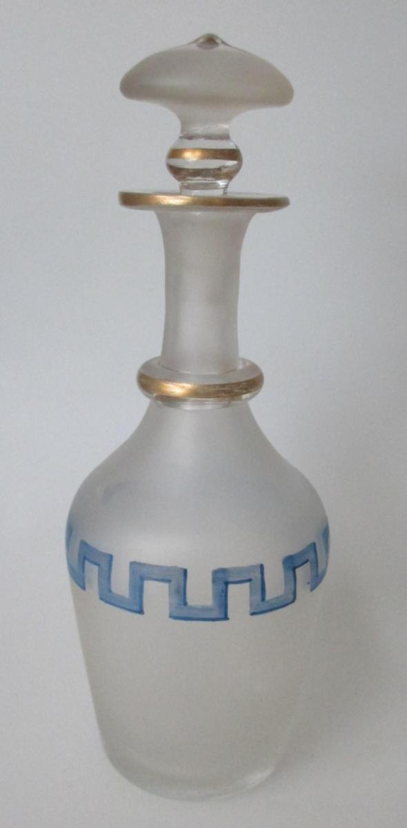 Tysk likør sæt i matteret sandblæst glas, 1003. Med forgyldning og bemalet bort. Bestående af bakke, 4 snapseglas og lille karaffel med prop. Højde karaffel:: 16,5 cm. Dia. bakke: 17,5 cm. På bakken label, hvor det er anført, at bakken er givet den 18. maj 1903.