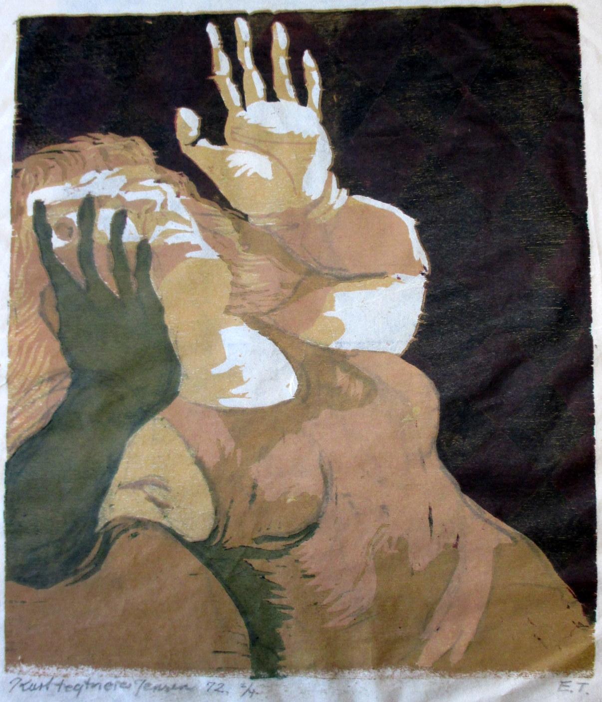 Tegtmeier, Kurt (1950 - ) Danmark: Komposition med kvinde. Farvelagt træsnit. Signeret.: Kurt Tegtmeier Jensen 72, no. 2/4. 30 x 25 cm.