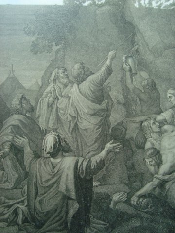 Text available in Danish: Kobberstik af Jean Baptiste Michel 1788 efter maleri af Nicolas Poussin 1649 - Moses Striking the Rock.