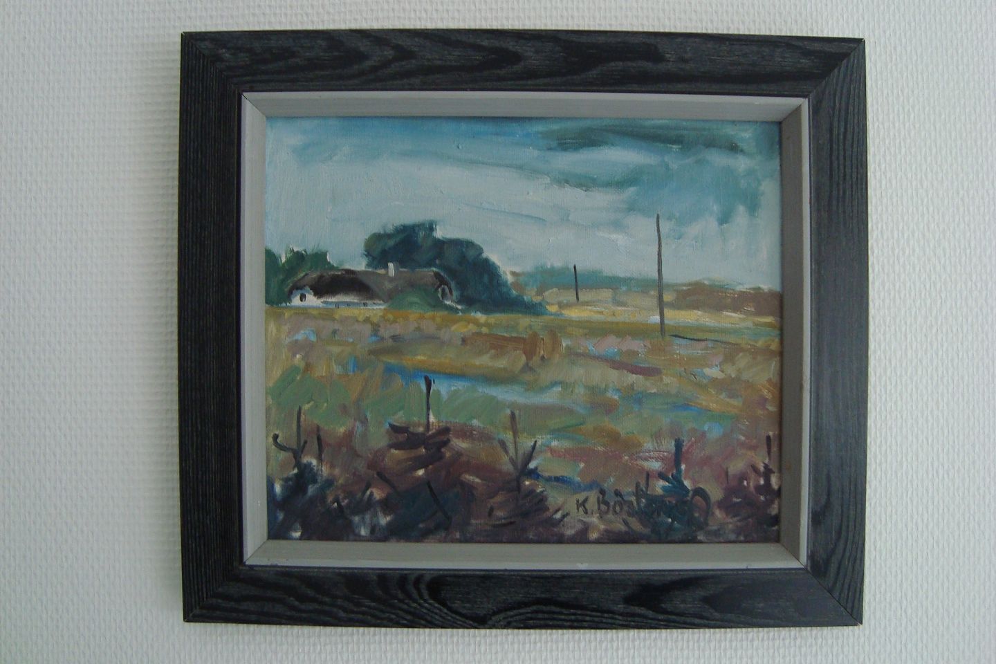 Maleri - Knud Bøstrup - Klitparti med graner og gård.