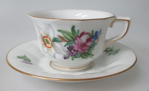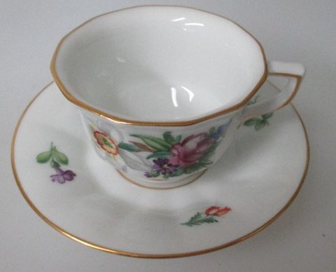 Mocca cups and saucers, 493/8562, Royal Copenhagen, Denmark. Hand painted with floral motifs and gilding. Angular. Height of cup: 5.2 cm. Dia. saucer: 12.4 cm. 1. quality.