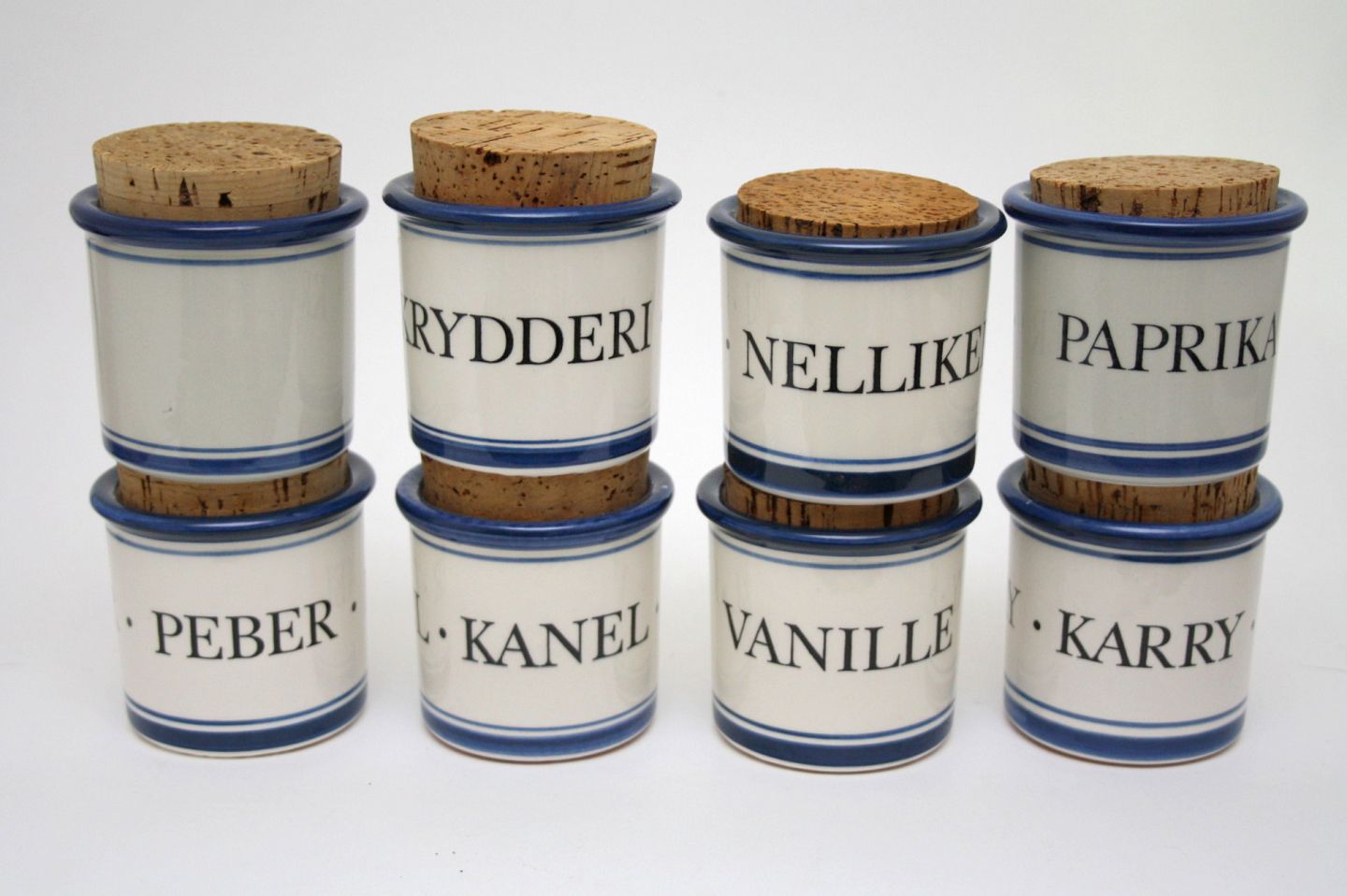 Text available in Danish: Knabstrup, Paprika krydderiserie designet af Inger Persson. Produceret fra 1976-82. Serien er også lavet i gul. Dekorationsnr. 831M blå. Pris pr. stk. 50 kr. Højde uden korkprop 7 cm. Diameter 8 cm. Alle i flot stand.