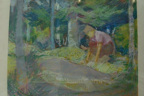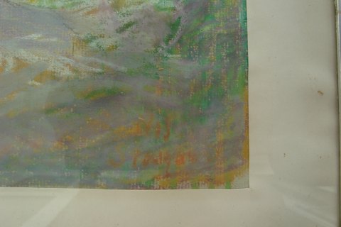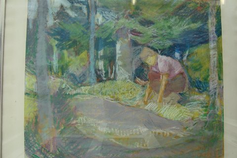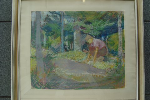 Pastel af Nis Stougaard - Pige ved skovsø 1950'erne.