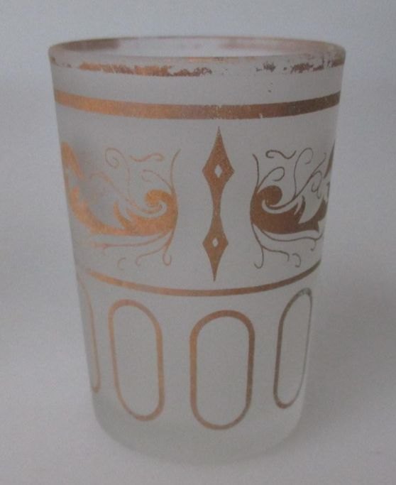 Vodka glas. Farveløs matteret glas. Tyskland, ca. 1880. Med forgyldning. H.: 6,3 cm.