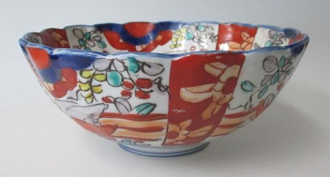 Japansk Imari skål, 19. årh. Dyb U form. Typisk dekoration med blomster i vase og fisk. Bølget kant. bemalet både ind- og udvendig. H.: 8,5 cm. Dia: 18,5 cm. Ustemplet.