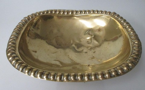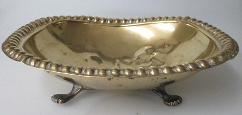 Spyt bakke, messing, Danmark. 10. årh. Med løve fødder og buklet kant. H.: 6 cm. 24 x 20,5 cm.