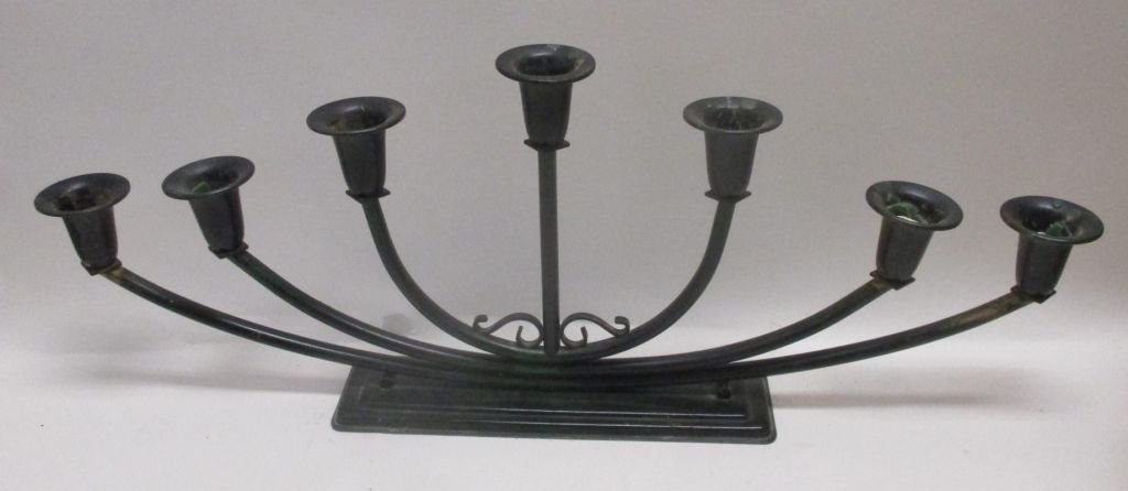7 armet stage, ca. 1930, Danmark. Grøn patineret messing på aflangt fodstykke. L.: 57 cm. Ingen synlige stempler.