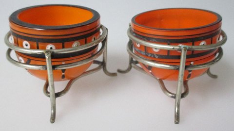 Et par saltkar i glas, Art Deco, ca. 1930. Klar glas med orange overfang. Med emalje bemalinger. Stativ i forsølvet metal. H.: 5 cm. Dia.: 6 cm.