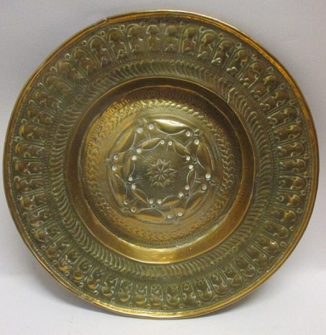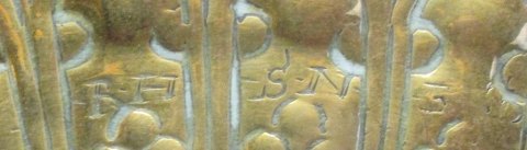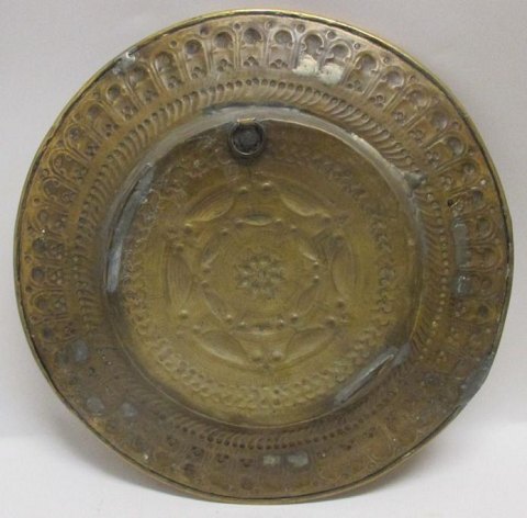 Dåbsfad i messing, 1755. Antagelig Tyskland. Dia.: 38,5 cm. Rigt dekoreret. På fanen initialerne: RH: SN 55.