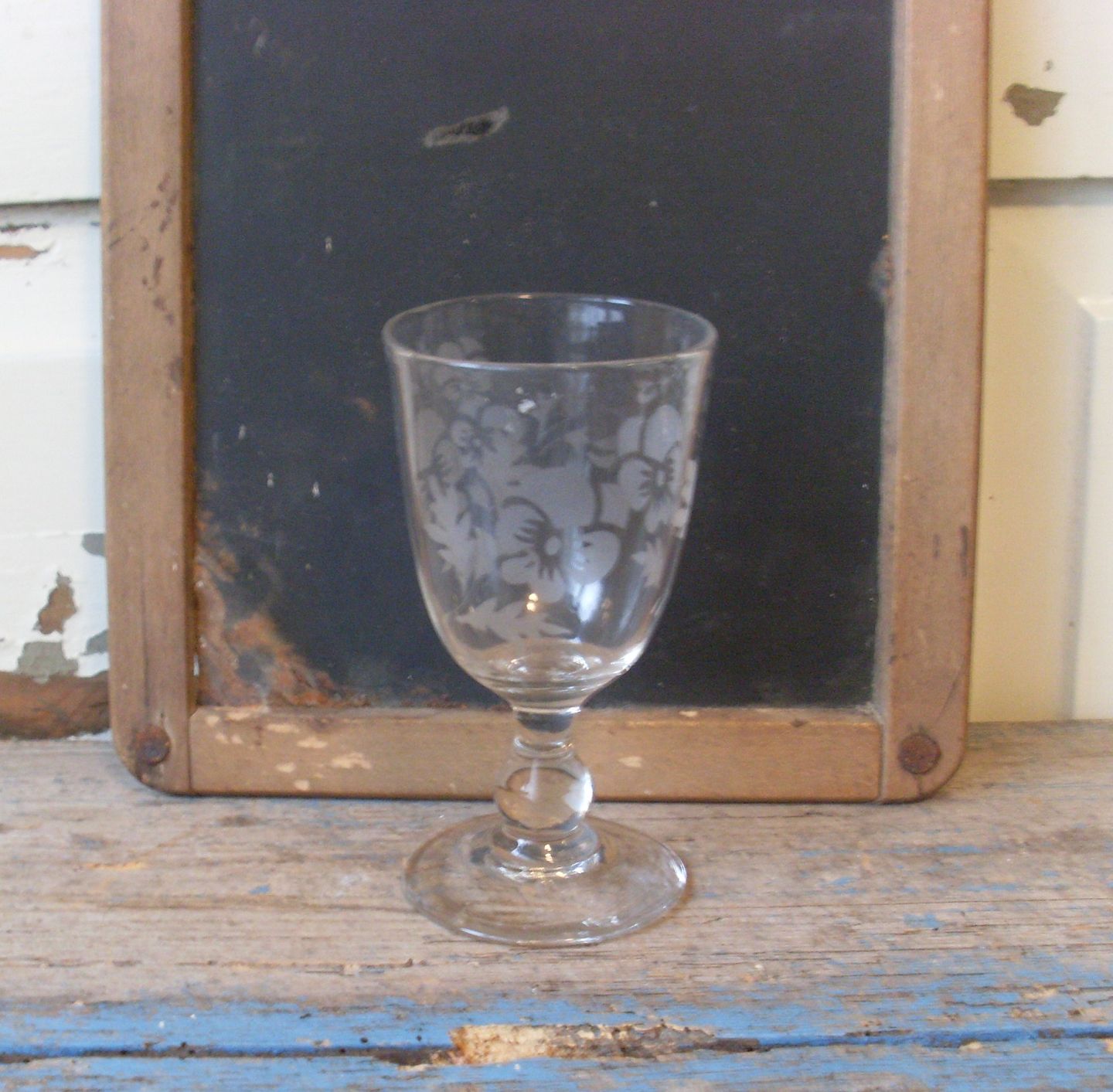 Gammelt fransk vinglas med ætset dekoration 13,5cm.