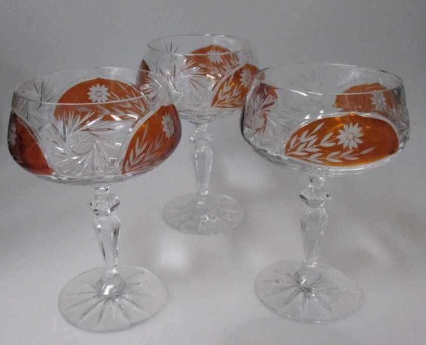 6 Champagne kummer, 20. årh., klart krystal glas med slibninger i den gule overfang. H.: 15 cm. Dia.: 10 cm.