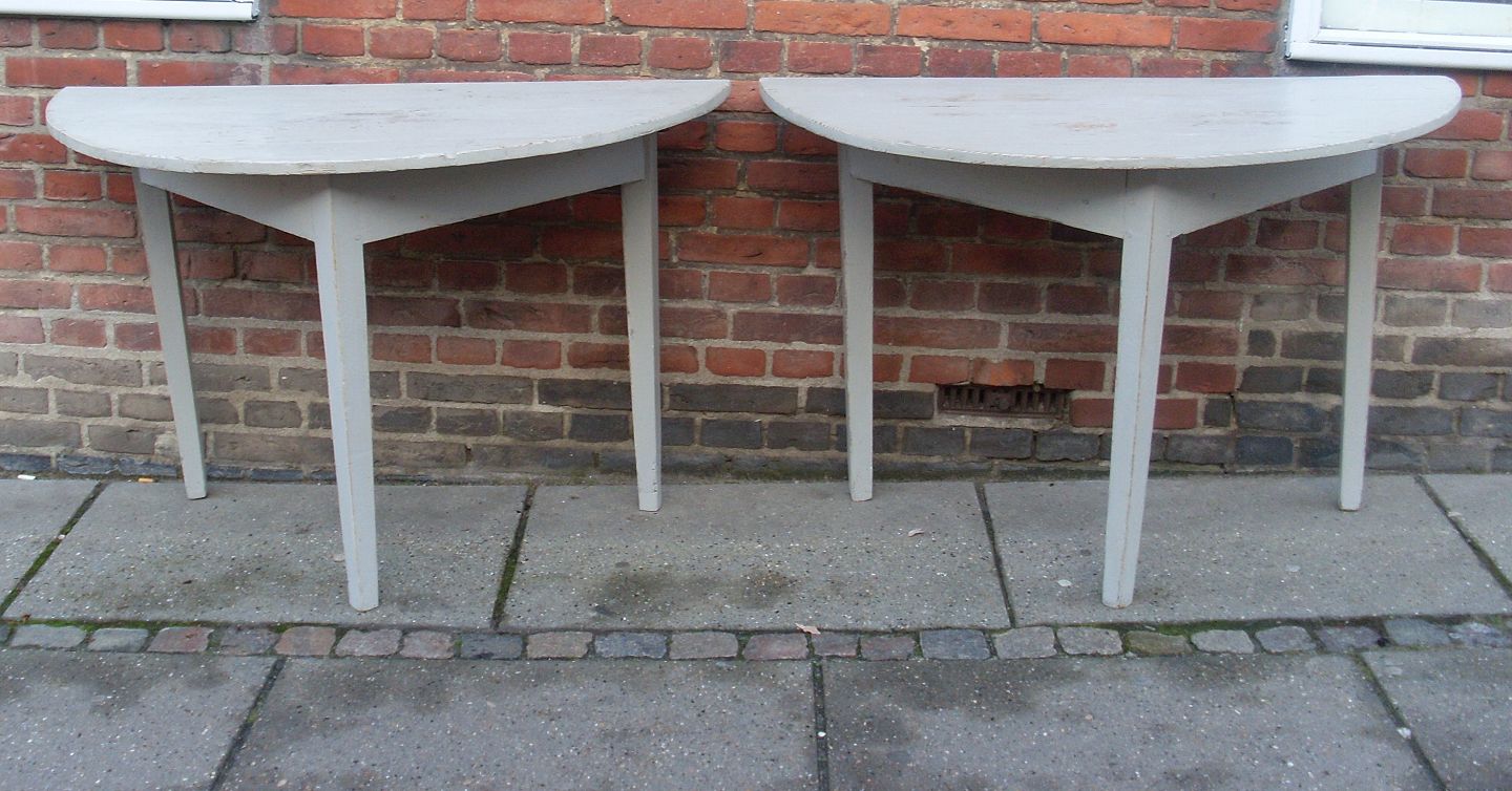 Par smukke gråmalede 1800tals halvrunde konsol borde.