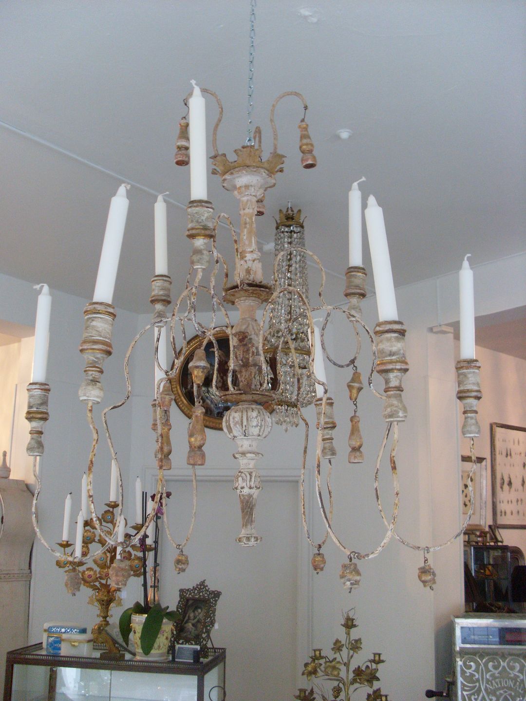 Meget smuk fransk lysekrone med stel i træ. 9 lys arme i metal, behængt med forgyldte træ prismer.